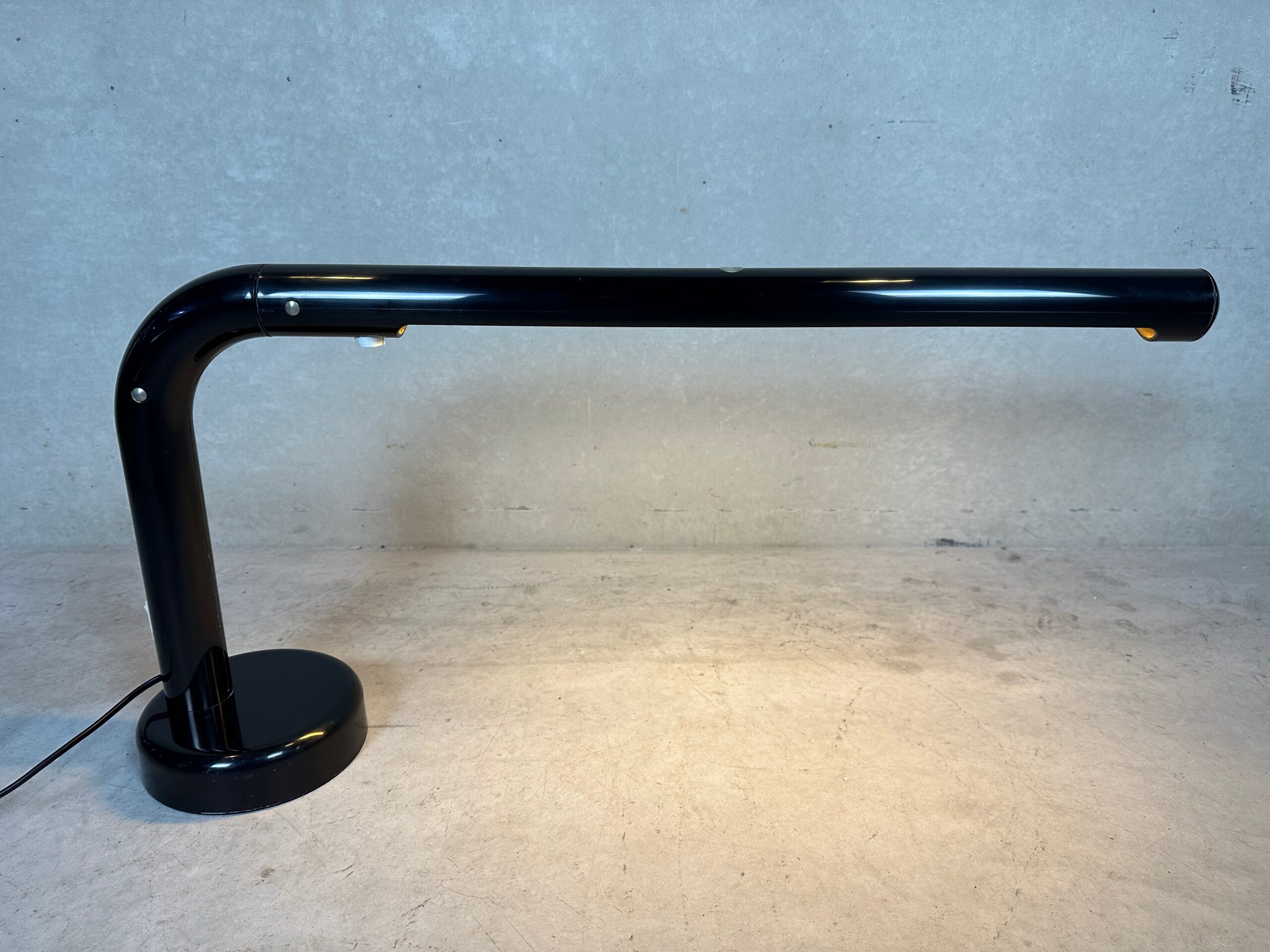 Zwarte tubular bureaulamp van Atelje Lyktan (Zweden). Ontwerp van Anders Pherson in 1970. Zware voet met een diameter van 17cm. Tube heeft een diameter van 5cm. Lengte: 80cm. Hoogte: 40cm. 1 nieuwe ongebruikte (enkel voor de foto’s) fluorescent lamp inclusief. 13Watt. Zeer lichte gebruikssporen. Modern. Gemerkt.